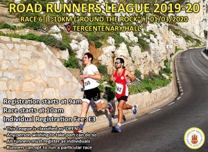 | Local | Road Races | 01/03/2020 | “Rock Runners” League Race 6 (“Round The Rock” ≈10km) | Tercentenary Hall | No | Yes |